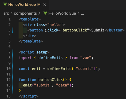 자식 컴포넌트 //HelloWorld.vue <template> <div class="hello"> <button @click="buttonClick">Submit</button> </div> </template> <script setup> import { defineEmits } from "vue"; const emit = defineEmits(["submit"]); function buttonClick() { emit("submit", "data"); } </script>